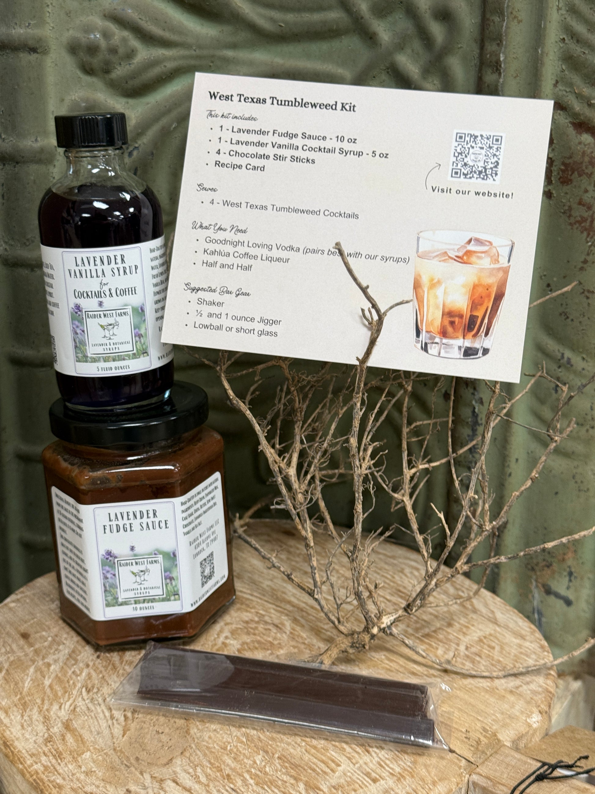 The West Texas Tumbleweed is our bold, indulgent twist on the classic mudslide — Texas style. Crafted with our Lavender Vanilla Syrup and rich Lavender Fudge Sauce, this creamy cocktail blends seamlessly with coffee liqueur and Goodnight Loving Vodka for a smooth, decadent sip. Finished with a specially made chocolate stir stick, it’s equal parts dessert and cocktail, with a subtle floral note that sets it apart.